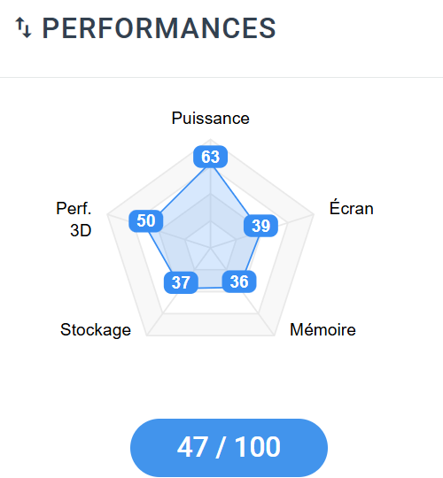 Les sous-indices vont dans le même sens. L’indice Puissance à 63/100 montre un niveau modeste mais pas dérisoire pour les usages essentiels. L’indice Mémoire à 36/100 alerte davantage sur la durée de vie pratique de la configuration, surtout avec 8 Go non évolutifs. L’indice Stockage à 37/100 confirme que l’espace disque est un compromis majeur. Enfin, l’indice Écran à 39/100 et l’indice Performance 3D à 50/100 rappellent que le confort visuel et les ambitions graphiques restent limités. La bonne lecture n’est donc pas “bon PC”, mais plutôt “portable simple dont le positionnement prix reste encore défendable”.