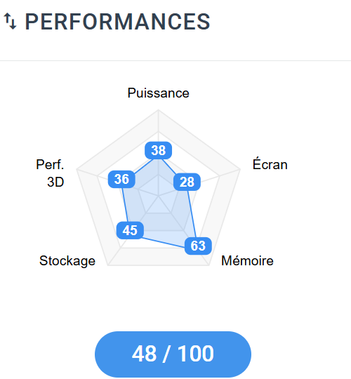 Les sous-indices aident à préciser le diagnostic. L’indice Puissance à 38/100 confirme une machine adaptée à un usage simple à intermédiaire, sans grosse réserve pour des besoins qui évolueront fortement. L’indice Écran à 28/100 rappelle que, malgré le confort du format 16/10, l’affichage n’est pas son grand levier de différenciation. L’indice Mémoire à 63/100 est en revanche plus rassurant : les 16 Go lui évitent l’écueil des configurations déjà trop justes aujourd’hui. Enfin, le Stockage à 45/100 place le SSD de 512 Go dans une zone correcte mais devenue assez standard, tandis que la Performance 3D à 36/100 invite clairement à rester prudent sur tout ce qui dépasse un usage graphique léger.