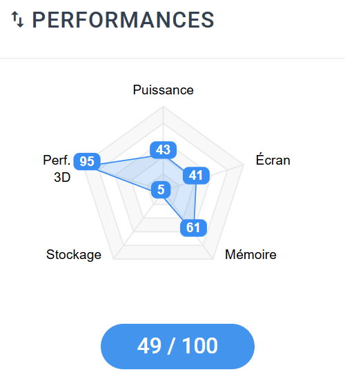 Les sous-indices confirment cette lecture nuancée. L’indice Puissance à 43/100 traduit une base correcte pour jouer et pour tenir des usages appuyés, mais pas une domination nette face aux configurations plus ambitieuses du marché. L’indice Écran à 41/100 montre une dalle convenable et adaptée au jeu grâce au 144 Hz, sans en faire un écran de standing supérieur. L’indice Mémoire à 61/100 est plutôt rassurant : 16 Go de DDR5 restent un vrai bon point aujourd’hui. En revanche, l’indice Stockage à 5/100 pèse lourd dans le jugement global : 512 Go, pour un portable gamer à ce prix, c’est vite serré. À l’inverse, l’indice Performance 3D à 95/100 rappelle que la vocation du produit est réelle côté jeu : sa carte graphique constitue clairement l’atout majeur de la machine.